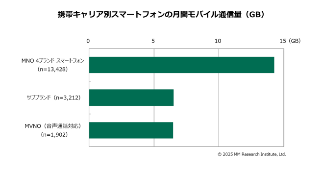 MM総研の調べによると、スマートフォンの平均データ使用量は月に約12GB、中央値では3GB前後とされています。