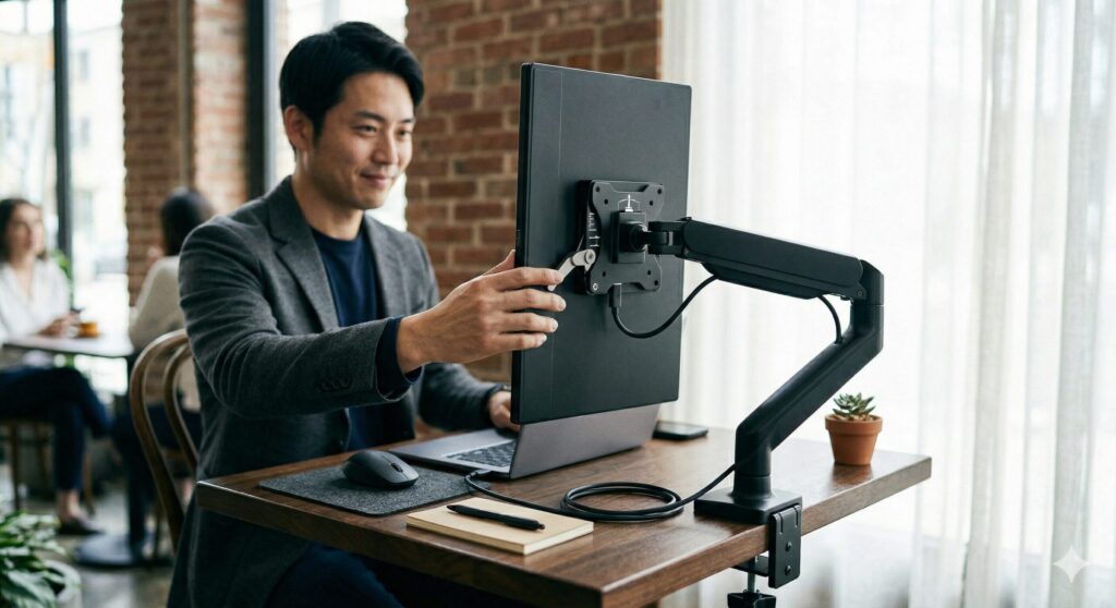 | STEP 2 | 🏠 自宅 | モニターアームにガチャンと装着 → 据え置きサブディスプレイとして活用 |