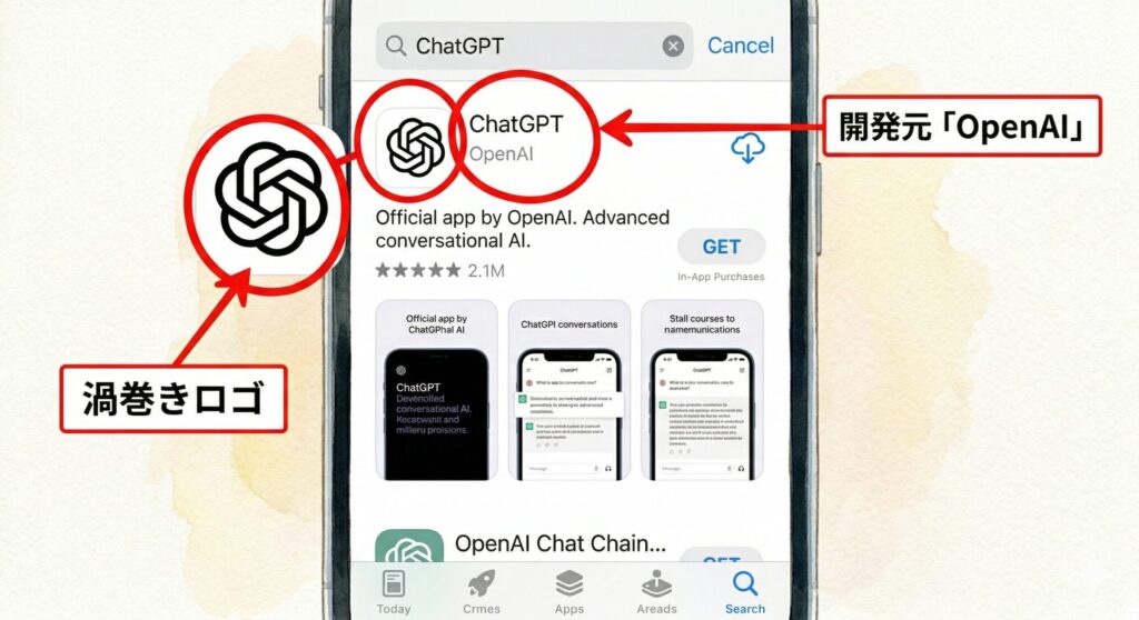 App StoreやGoogle Playには、ChatGPTに似た名前の「偽アプリ」がいくつか存在します。間違ったアプリをインストールしないために、以下の2点を必ず確認してください。