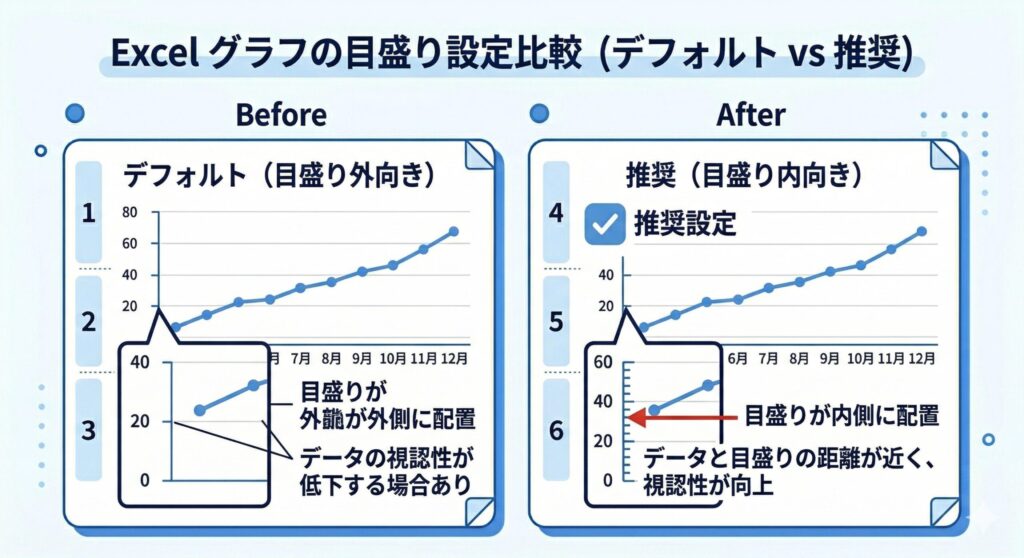 グラフの軸の目盛りは、デフォルトでは外向きになっています。これを内向きに変えると、一気に「技術資料らしい」印象になります。実はこの設定、日本のJIS規格や学術論文でも推奨されている形式です。大学のゼミで教わってから、私はずっとこだわっています。