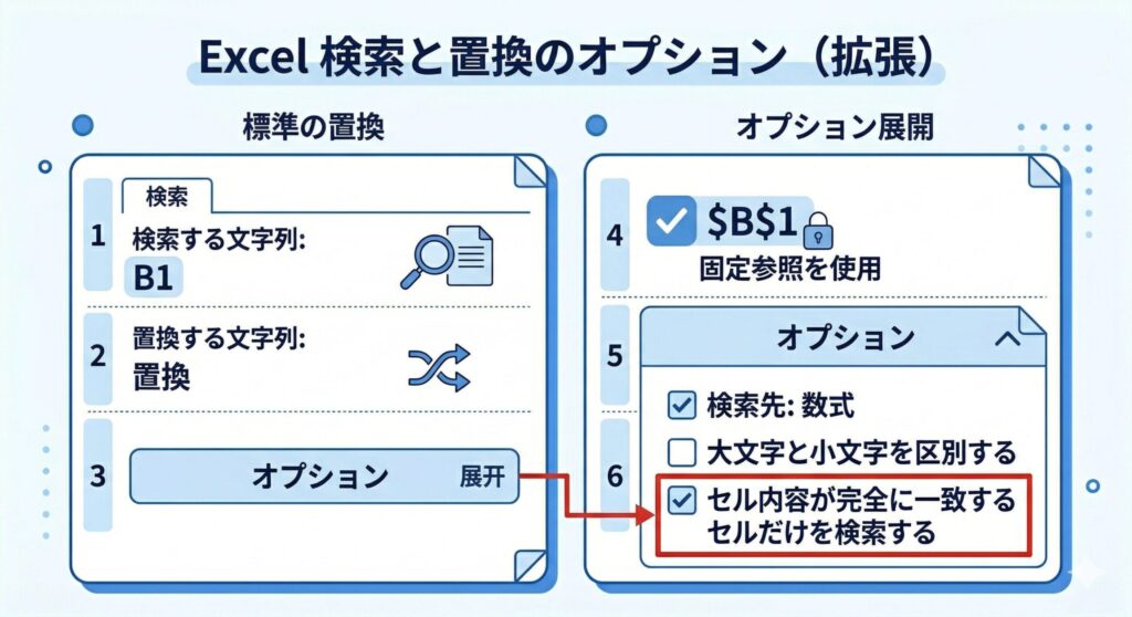 こういったミスを防ぐには、置換ダイアログの「オプション」→ 「セル内容が完全に一致するセルだけを検索する」 にチェックを入れる習慣が大切です。