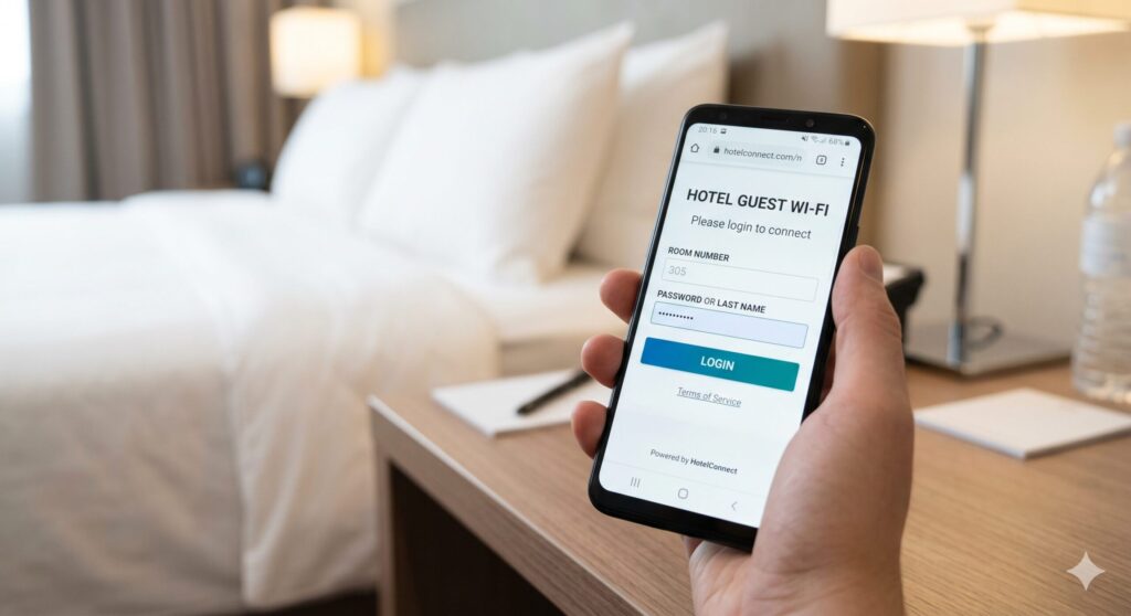 ビジネスホテルのWi-Fiに繋ごうとすると、「部屋番号とパスワードを入力してください」というWebページが出ることがありますよね。